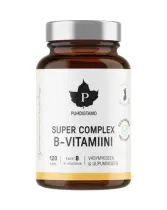 Puhdistamo Super Complex B-Vitamiini on vahva B-vitamiinituote, joka sisältää sekoituksen 10 eri B-ryhmän vitamiinia optimaalisessa suhteessa ja todella hyvin imeytyvissä muodoissa. B-ryhmän vitamiinit osallistuvat ravintoaineiden energia-aineenvaihduntaan, hermoston ja aivosolujen toimintaan sekä sydän- ja verisuoniterveyteen. Puhdistamo Super Complex B-Vitamiini tukee myös ihon, hiusten, lihasten ja luuston hyvinvointia.