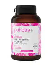 Puhdas+ Beauty Kollageeni & Biotiini, 120 kaps. tarjoaa hyvinvointia iholle, hiuksille ja kynsille! Puhdas+ Kollageeni & Biotiini on suunniteltu tukemaan kauneutta kokonaisvaltaisesti. Valmiste sisältää tehokkaan ja hyvin imeytyvän yhdistelmän hydrolysoitua kalakollageenia, biotiinia, sinkkiä ja C-vitamiinia. Tuote sisältää kalakollageenia, joka on kalasta eristetty proteiini. Kollageeni muodostaa 30 % ihmisen elimistön proteiinista ja sitä löytyy erityisesti ihosta. Noin 25 vuoden iässä elimistö alkaa menettää kykynsä tuottaa uutta kollageenia.